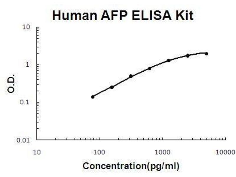 - human AFP ELISA Kit was based on standard sandwich enzyme-linked immune-sorbent assay technology. A monoclonal antibody from mouse specific for AFP has been precoated onto 96-well plates. Standards (Expression system for standard: NSO, Immunogen sequence: R19-V609) and test samples are added to the wells, a biotinylated detection polyclonal antibody from goat specific for AFP is added subsequently and then followed by washing with PBS or TBS buffer. Avidin-Biotin-Peroxidase Complex was added and unbound conjugates were washed away with PBS or TBS buffer. HRP substrate TMB was used to visualize HRP enzymatic reaction. TMB was catalyzed by HRP to produce a blue color product that changed into yellow after adding acidic stop solution. The density of yellow is proportional to the human AFP amount of sample captured in plate.