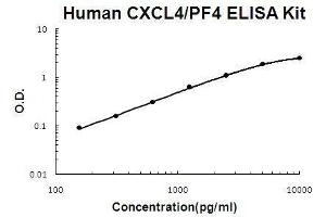 - human CXCL4 ELISA Kit was based on standard sandwich enzyme-linked immune-sorbent assay technology. A monoclonal antibody from mouse specific for CXCL4 has been precoated onto 96-well plates. Standards(Expression system for standard: E.coli, Immunogen sequence: E32-S101) and test samples are added to the wells, a biotinylated detection polyclonal antibody from goat specific for CXCL4 is added subsequently and then followed by washing with PBS or TBS buffer. Avidin-Biotin-Peroxidase Complex was added and unbound conjugates were washed away with PBS or TBS buffer. HRP substrate TMB was used to visualize HRP enzymatic reaction. TMB was catalyzed by HRP to produce a blue color product that changed into yellow after adding acidic stop solution. The density of yellow is proportional to the human CXCL4 amount of sample captured in plate.