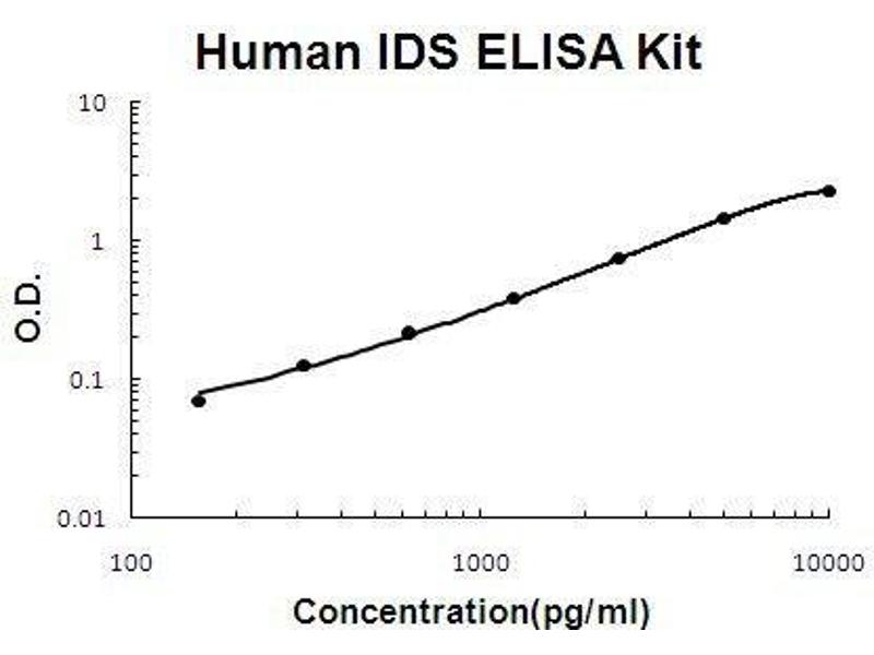 - human IDS ELISA Kit was based on standard sandwich enzyme-linked immune-sorbent assay technology. A monoclonal antibody from mouse specific for IDS has been precoated onto 96-well plates. Standards(Expression system for standard: NSO, Immunogen sequence: S26-P550) and test samples are added to the wells, a biotinylated detection polyclonal antibody from goat specific for IDS is added subsequently and then followed by washing with PBS or TBS buffer. Avidin-Biotin-Peroxidase Complex was added and unbound conjugates were washed away with PBS or TBS buffer. HRP substrate TMB was used to visualize HRP enzymatic reaction. TMB was catalyzed by HRP to produce a blue color product that changed into yellow after adding acidic stop solution. The density of yellow is proportional to the human IDS amount of sample captured in plate.