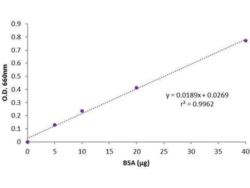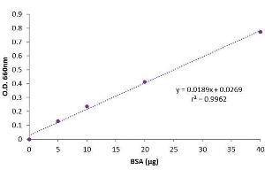 1.If the spectrophotometer or microplate reader was not zeroed with the blank, then average the blank values and substract the average blank value from the standard and unknown sample values. 2.Create a standard curve by plotting A660nm (y-axis) vs BSA standard (μg) (x-axis). Determine the unknown sample concentration using the standard curve . 3.The level of detection of the assay is lower for the microplate assay when compared with the microassay due to a shorter light path used in the microplate reader. 4.Standard curve example for microplate assay procedure is shown in Figure 2 (see Images). A sample Lowry protein assay standard curve produced using BSA at triplicate points in a range of 5 to 280 μg is shown in Figure 3 (see images). The data are fit with a polynomic regression.