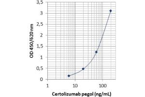 - This ELISA is based on Certolizumab pegol-specific mouse monoclonal antibody (catcher Ab, clone CY). Standards and diluted samples are incubated in the microtiter plate coated with IG-CY mAb. After incubation, the wells are washed. A biotinylated recombinant human tumor necrosis factor alpha (rhTNFα) is added and binds to the Fab part of Certolizumab pegol. Following incubation, wells are washed and the horseradish peroxidase (HRP)-conjugated streptavidin is added and binds to the biotinylated rhTNFα. Following incubation, wells are washed and the bound enzymatic activity is detected by addition of chromogen-substrate. The colour developed is proportional to the amount of Certolizumab pegol in the sample or standard. Results of samples can be determined by using the standard curve. Preincubation of Certolizumab pegol with rhTNFα inhibited the reaction in a concentration dependent manner. Therefore, the Certolizumab pegol ELISA (mAb-based) measures the free form of Certolizumab pegol.