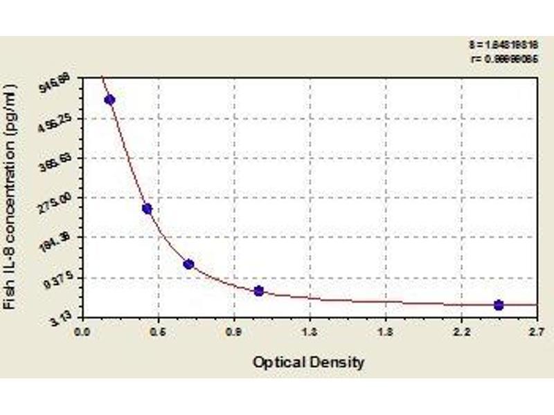 Create a standard curve by reducing the data using computer software capable of generating a four parameter logistic (4-PL) curve fit. As an alternative, construct a standard curve by plotting the mean absorbance for each standard on the x-axis against the concentration on the y-axis and draw a best fit curve through the points on the graph. The data may be linearized by plotting the log of the target antigen concentration versus the log of the O.D. and the best fit line can be determined by regression analysis. This procedure will produce an adequate but less precise fit of the data.