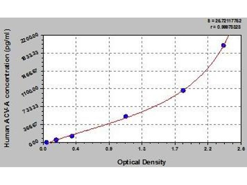 - The microtiter plate provided in this kit has been pre-coated with an antibody specific to ACV-A. Standards or samples are then added to the appropriate microtiter plate wells with a Horseradish Peroxidase (HRP)-conjugated antibody preparation specific for ACV-A and incubated. Then substrate solution A and B are added to each well. Only those wells that contain ACV-A, HRP-conjugated antibody will exhibit a change in color. The enzyme-substrate reaction is terminated by the addition of a sulphuric acid solution and the color change is measured spectrophotometrically at a wavelength of 450 nm ± 2 nm. The concentration of ACV-A in the samples is then determined by comparing the O.D. of the samples to the standard curve.