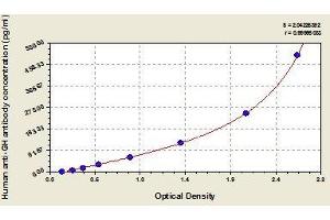 - The microtiter plate provided in this kit has been pre-coated with GH antigen. Standards or samples are then added to the appropriate microtiter plate wells with biotin-conjugated GH and Avidin conjugated to Horseradish Peroxidase (HRP) is added to each microplate well and incubated. Then a TMB (3,3',5,5' tetramethyl-benzidine) substrate solution is added to each well. Only those wells that contain GH Ab, biotin-conjugated GH and enzyme-conjugated Avidin will exhibit a change in color. The enzyme-substrate reaction is terminated by the addition of a sulphuric acid solution and the color change is measured spectrophotometrically at a wavelength of 450 nm ± 2 nm. The concentration of GH Ab in the samples is then determined by comparing the O.D. of the samples to the standard curve.