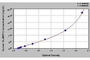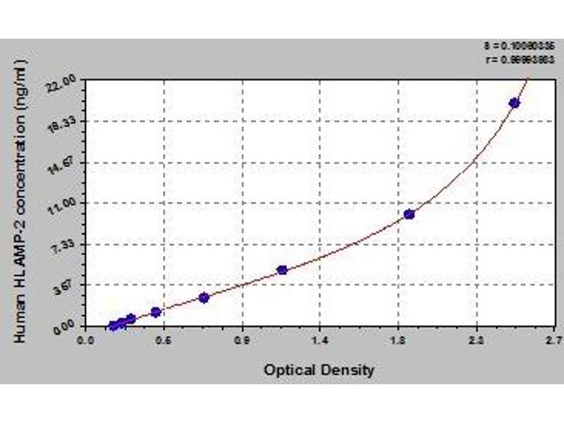 This assay employs the quantitative sandwich enzyme immunoassay technique. Antibody specific for HLAMP-2 has been pre-coated onto a microplate. Standards and samples are pipetted into the wells and any HLAMP-2 present is bound by the immobilized antibody. After removing any unbound substances, a biotin-conjugated antibody specific for HLAMP-2 is added to the wells. After washing, avidin conjugated Horseradish Peroxidase (HRP) is added to the wells. Following a wash to remove any unbound avidin-enzyme reagent, a substrate solution is added to the wells and color develops in proportion to the amount of HLAMP-2 bound in the initial step. The color development is stopped and the intensity of the color is measured.