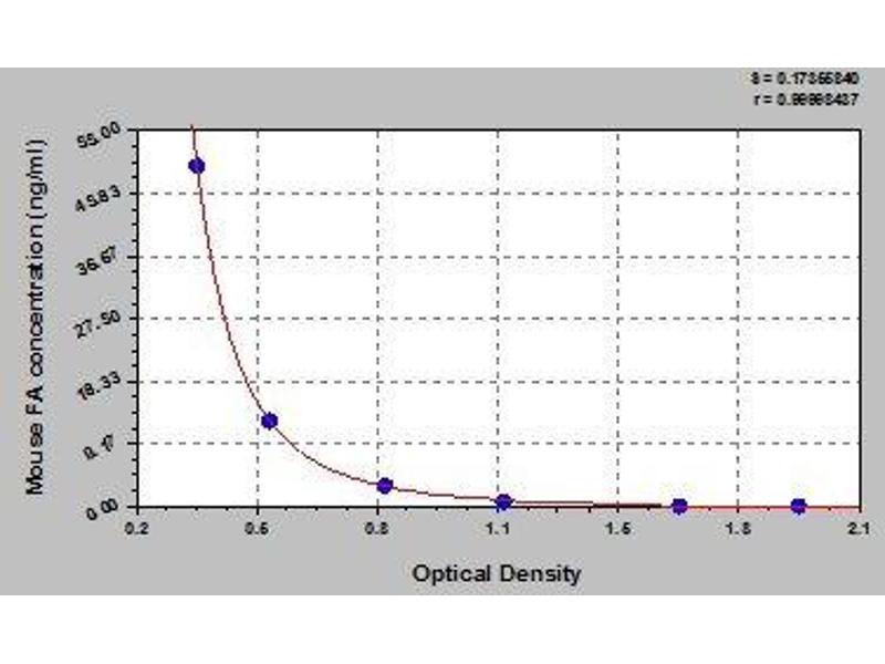 Create a standard curve by reducing the data using computer software capable of generating a four parameter logistic (4-PL) curve fit. As an alternative, construct a standard curve by plotting the mean absorbance for each standard on the x-axis against the concentration on the y-axis and draw a best fit curve through the points on the graph. The data may be linearized by plotting the log of the target antigen concentration versus the log of the O.D. and the best fit line can be determined by regression analysis. This procedure will produce an adequate but less precise fit of the data.