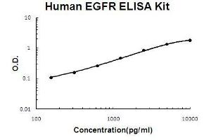 - human EGFR ELISA Kit was based on standard sandwich enzyme-linked immune-sorbent assay technology. A monoclonal antibody from mouse specific for EGFR has been precoated onto 96-well plates. Standards(NSO, M1-S645) and test samples are added to the wells, a biotinylated detection polyclonal antibody from goat specific for EGFR is added subsequently and then followed by washing with PBS or TBS buffer. Avidin-Biotin-Peroxidase Complex was added and unbound conjugates were washed away with PBS or TBS buffer. HRP substrate TMB was used to visualize HRP enzymatic reaction. TMB was catalyzed by HRP to produce a blue color product that changed into yellow after adding acidic stop solution. The density of yellow is proportional to the human EGFR amount of sample captured in plate.