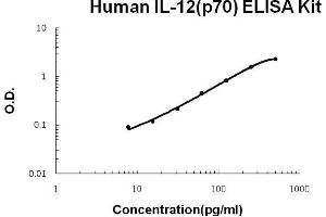- human IL-12(P70) ELISA Kit was based on standard sandwich enzyme-linked immune-sorbent assay technology. A monoclonal antibody from mouse specific for IL-12(P70) has been precoated onto 96-well plates. Standards(sf21, (I23-S328)+(R23-S219)) and test samples are added to the wells, a biotinylated detection polyclonal antibody from goat specific for IL-12(P70) is added subsequently and then followed by washing with PBS or TBS buffer. Avidin-Biotin-Peroxidase Complex was added and unbound conjugates were washed away with PBS or TBS buffer. HRP substrate TMB was used to visualize HRP enzymatic reaction. TMB was catalyzed by HRP to produce a blue color product that changed into yellow after adding acidic stop solution. The density of yellow is proportional to the human IL-12(P70) amount of sample captured in plate.