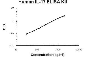 - human IL-17 ELISA Kit was based on standard sandwich enzyme-linked immune-sorbent assay technology. A monoclonal antibody from mouse specific for IL-17 has been precoated onto 96-well plates. Standards(E.coli, I20-A155) and test samples are added to the wells, a biotinylated detection polyclonal antibody from goat specific for IL-17 is added subsequently and then followed by washing with PBS or TBS buffer. Avidin-Biotin-Peroxidase Complex was added and unbound conjugates were washed away with PBS or TBS buffer. HRP substrate TMB was used to visualize HRP enzymatic reaction. TMB was catalyzed by HRP to produce a blue color product that changed into yellow after adding acidic stop solution. The density of yellow is proportional to the human IL-17 amount of sample captured in plate.