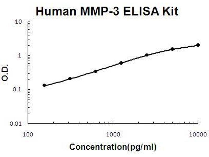 Background: Matrix metalloproteinase-3(MMP-3) also called stromelysin or transin, is a proteoglycanase closely related to collagenase(MMP1) with a wide range of substrate specificities. The complete primary structure for human MMP-3, which has 477 residues including a 17-residue signal peptide. MMP-3 and collagenase are 54 % identical in sequence, suggesting a common origin for the evolution of the two proteinases. MMP-3 and collagenase expression are coordinately modulated in synovial fibroblast cultures. MMP-3 is a secreted metalloprotease produced predominantly by connective tissue cells. Together with other metalloproteases, it can synergistically degrade the major components of the extracellular matrix. It is capable of degrading proteoglycan, fibronectin, laminin, and type IV collagen, but not interstitial type I collagen. MMP-3 genotype may be an important determinant of vascular remodeling and age-related arterial stiffening, with the heterozygote having the optimal balance between matrix accumulation and deposition. The standard product used in this kit is recombinant human MMP-3, consisting of 460 amino acids with the molecular mass of 52KDa. The detected MMP-3 includes zymogen and active enzyme.