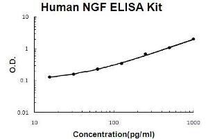 - human NGF ELISA Kit was based on standard sandwich enzyme-linked immune-sorbent assay technology. A monoclonal antibody from mouse specific for NGF has been precoated onto 96-well plates. Standards(NSO, S122-A241) and test samples are added to the wells, a biotinylated detection polyclonal antibody from goat specific for NGF is added subsequently and then followed by washing with PBS or TBS buffer. Avidin-Biotin-Peroxidase Complex was added and unbound conjugates were washed away with PBS or TBS buffer. HRP substrate TMB was used to visualize HRP enzymatic reaction. TMB was catalyzed by HRP to produce a blue color product that changed into yellow after adding acidic stop solution. The density of yellow is proportional to the human NGF amount of sample captured in plate.