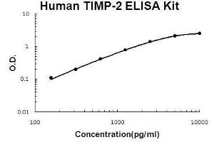 - human TIMP-2 ELISA Kit was based on standard sandwich enzyme-linked immune-sorbent assay technology. A monoclonal antibody from mouse specific for TIMP-2 has been precoated onto 96-well plates. Standards(CHO, C27-P220) and test samples are added to the wells, a biotinylated detection polyclonal antibody from goat specific for TIMP-2 is added subsequently and then followed by washing with PBS or TBS buffer. Avidin-Biotin-Peroxidase Complex was added and unbound conjugates were washed away with PBS or TBS buffer. HRP substrate TMB was used to visualize HRP enzymatic reaction. TMB was catalyzed by HRP to produce a blue color product that changed into yellow after adding acidic stop solution. The density of yellow is proportional to the human TIMP-2 amount of sample captured in plate.
