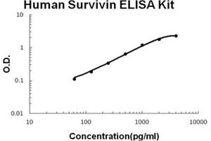 - human Survivin ELISA Kit was based on standard sandwich enzyme-linked immune-sorbent assay technology. A monoclonal antibody from mouse specific for Survivin has been precoated onto 96-well plates. Standards(E.coli, M1-D142) and test samples are added to the wells, a biotinylated detection polyclonal antibody from goat specific for Survivin is added subsequently and then followed by washing with PBS or TBS buffer. Avidin-Biotin-Peroxidase Complex was added and unbound conjugates were washed away with PBS or TBS buffer. HRP substrate TMB was used to visualize HRP enzymatic reaction. TMB was catalyzed by HRP to produce a blue color product that changed into yellow after adding acidic stop solution. The density of yellow is proportional to the human Survivin amount of sample captured in plate.