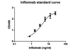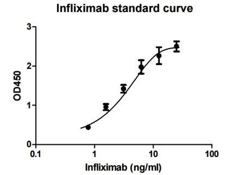 - The Infliximab ELISA kit is designed to measure free Infliximab with high specificity and sensitivity . This assay employs the sandwich enzyme immunoassay technique. A precoated anti-Infliximab 96 well plate is provided. Calibrator, quality control samples and test samples are pipetted into the appropriate wells. Infliximab present in biological matrices is bound by the immobilized capture antibody. After washing away any unbound substances, enzyme linked detection antibody is added to the wells. The plate is washed to remove any unbound antibody-enzyme reagent and a substrate solution is added to the wells for color development. The color development is proportional to the amount of Infliximab present in test samples and the concentration is calculated from the standard series.