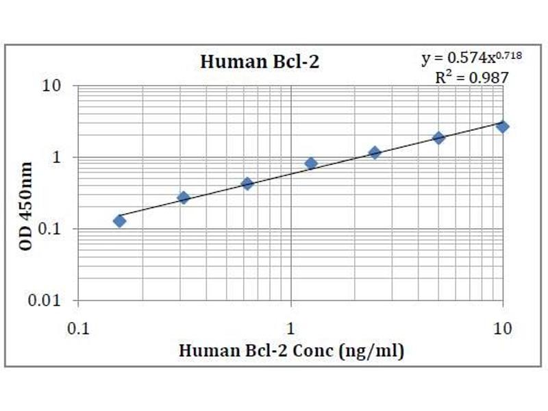 - This kit was based on sandwich enzyme-linked immune-sorbent assay technology. Anti- Human Bcl-2 antibody was pre-coated into 96-well plates. Biotin conjugated anti-human Bcl-2 detection antibody was used. Standards, test samples and biotin conjugated detection antibody were added to the wells subsequently. Wash buffer was used to wash any non-specific binding. HRP conjugated Streptavidin was used as secondary antibody. TMB substrates were used to visualize HRP enzymatic reaction. TMB was catalyzed by HRP to produce a blue color product that changed into yellow after adding acidic stop solution. The density of yellow is proportional to the Human Bcl-2 amount of samples captured in the plate. Optical Density (O.D) can be read at absorbance 450nm in a microplate reader. Concentration of Human Bcl-2 can be calculated using the standard curve.