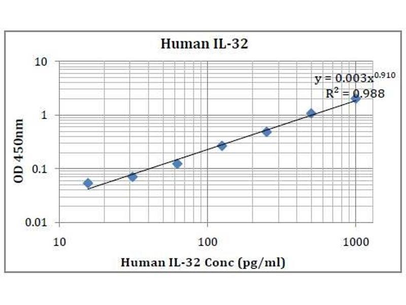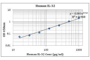- This kit was based on sandwich enzyme-linked immune-sorbent assay technology. Anti- Human IL-32 antibody was pre-coated into 96-well plates. Biotin conjugated anti-human IL-32 detection antibody was used. Standards, test samples and biotin conjugated detection antibody were added to the wells subsequently. Wash buffer was used to wash any non-specific binding. HRP conjugated Streptavidin was used as secondary antibody. TMB substrates were used to visualize HRP enzymatic reaction. TMB was catalyzed by HRP to produce a blue color product that changed into yellow after adding acidic stop solution. The density of yellow is proportional to the Human IL-32 amount of samples captured in the plate. Optical Density (O.D) can be read at absorbance 450nm in a microplate reader. Concentration of Human IL-32 can be calculated using the standard curve.