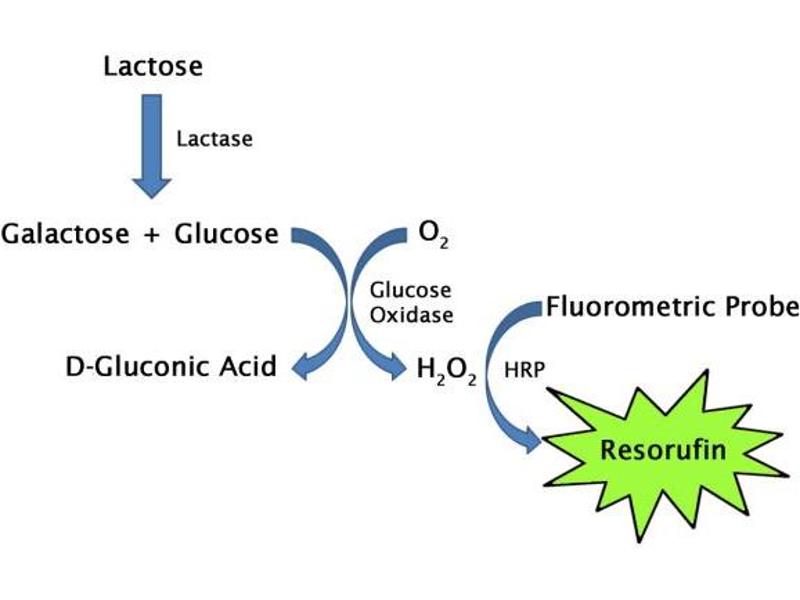 - First, lactase cleaves lactose into glucose and galactose. Glucose is oxidized by glucose oxidase into D-gluconic acid plus hydrogen peroxide. The hydrogen peroxide is then detected with a highly specific fluorometric probe. Horseradish peroxidase catalyzes the reaction between the probe and hydrogen peroxide, which bind in a 1:1 ratio. Samples are compared to a known concentration of lactose standard within the 96-well microtiter plate format. Samples and standards are incubated for 45 minutes and then read with a standard 96-well fluorometric plate reader . *Note: Endogenous levels of glucose can interfere with the assay. Therefore an endogenous control must be run for each sample to account for potential interference of these molecules.