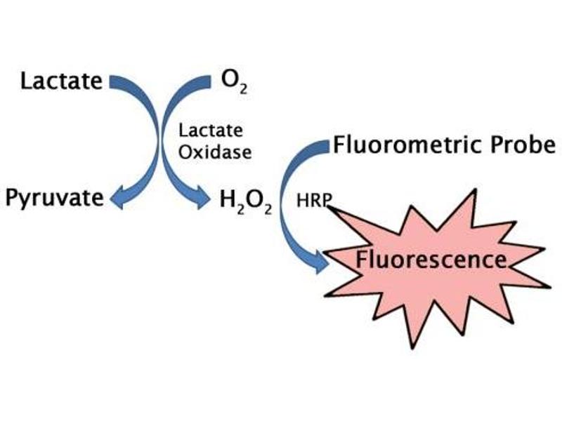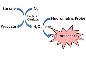 - Lactate is oxidized by lactate oxidase into pyruvate and hydrogen peroxide. The hydrogen peroxide is then detected with a highly specific Fluorometric probe. Horseradish peroxidase catalyzes the reaction between the probe and hydrogen peroxide, which bind in a 1:1 ratio. Samples and standards are incubated for 30-45 minutes and then read with a standard 96-well Fluorometric plate reader . Samples are compared to a known concentration of lactate standard within the 96-well microtiter plate format.
