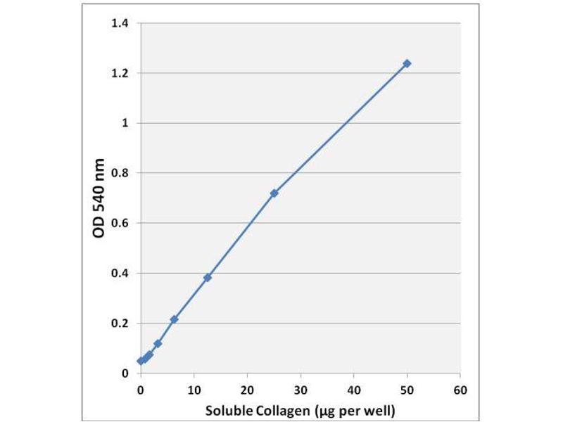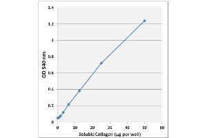 - Soluble Collagen Assay Kit provides a convenient colorimetric method for the detection of soluble collagen from cell or tissue samples. First, the unknown samples or collagen standards are added to a 96 well plate and dried down overnight. Then, a Sirius Red reagent is added to stain the [Gly-x-y] triple helix structure of collagen. Finally, the stained collagen is washed with an Acidic Reagent, eluted from the plate with a Basic Reagent, transferred to a new 96 well plate and measured by a plate spectrophotometer. The amount of collagen in the unknown samples is determined by comparing with a predetermined collagen standard curve. The provided reagents are sufficient for the evaluation of 96 assays including standards and unknown samples.