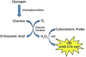 - Glycogen is broken down into glucose monomers by amyloglucosidase first, glucose is then oxidized by glucose oxidase into D-gluconic acid and hydrogen peroxide. The resulting hydrogen peroxide is then detected with a highly specific colorimetric probe. Horseradish peroxidase catalyzes the reaction between the probe and hydrogen peroxide, which bind in a 1:1 ratio. Samples are compared to a known concentration of glycogen standard within the 96-well microtiter plate format. Samples and standards are incubated for 45 minutes and then read with a standard 96-well colorimetric plate reader .