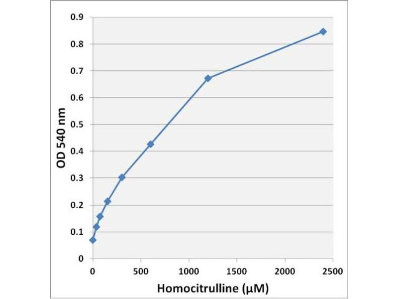 - First, the samples are treated with sodium dodecyl sulfate (SDS) and Proteinase K to release free homocitrulline/citrulline residues. Assay Reagents are added to the well which reacts with homocitrulline and citrulline to produce a chromophore and the absorbance is read at 540- 560 nm. The content of homocitrulline and citrulline in the unknown samples is determined by comparison with a predetermined standard curve. The provided reagents are sufficient for the evaluation of 100 assays including standards and unknown samples. 2 A B C . Mechanisms of (A) Homocitrullination (Carbamylation) of Proteins by Isocyanic Acid. (B) Citrulline Formation by NOS. (C) Citrullination of Proteins by PAD.