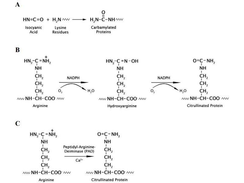 - Homocitrulline is an amino acid found in mammalian metabolism as a free-form metabolite of ornithine (another amino acid not found in proteins but is involved in the urea cycle). Through the process of carbamylation, homocitrulline amino acid residues can also be formed in proteins. Carbamylation results from the binding of isocyanic acid with amino groups (isocyanic acid spontaneously derived from high concentrations of urea) and primarily leads to the formation of either N-terminally carbamylated proteins and/or carbamylated lysine side chains (forming homocitrulline residues) (Figure 1A). It is known that elevated urea directly induces the formation of potentially atherogenic carbamylated LDL (cLDL). High blood concentrations of urea leading to the carbamylation process were detected in uremic patients and patients with end-stage renal disease. Homocitrulline can be detected in larger amounts in the urine of individuals with urea cycle disorders. Citrulline is an amino acid very similar in structure to homocitrulline, however, the former is one methylene group shorter than the latter. In mammals, free citrulline is produced from free arginine during the enzymatic generation of nitric oxide (NO) by nitric oxide synthase (NOS) (Figure 1B). In addition, citrulline is synthesized from ornithine and carbamoyl phosphate in one of the main reactions of the urea cycle, a process that causes excretion of ammonia. Citrulline is not normally incorporated into proteins, but can be found in proteins due to post translational modification. The enzyme pepdidylarginine deiminase (PADI) can convert arginine to citrulline in the presence of calcium (Figure 1C). Since rheumatoid arthritis (RA) patients often produce autoantibodies to peptides containing citrulline, it has been suggested that PADI enzymes are involved in the disease. Recently it has been shown that haplotype PADI4 is associated with susceptibility to RA. Homocitrulline has been suggested as a confounding antigen for rheumatoid arthritis antibodies targeting citrullinated proteins/peptides. Antibodies binding to homocitrulline-containing sequences have been found in rheumatoid arthritis patients' sera. It has also been shown that homocitrulline-containing proteins are present in rheumatoid arthritis (RA) joints.