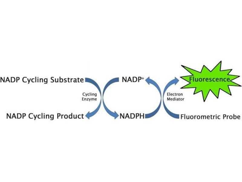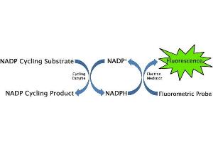 - + +NADP /NADPH Assay Kit is a convenient quantitative tool that measures NADP and NADPH within biological samples. The assay is based on an enzymatic cycling reaction in which + NADP is reduced to NADPH. NADPH reacts with a fluorometric probe that produces a product which can be measured with a standard 96-well fluorometric plate reader. The intensity of the product + fluorescence is proportional to the NADP and NADPH within a sample. A simple acid or base + treatment will differentiate NADPH from NADP within a sample. Samples and standards are incubated for 1-2 hours and then read at λex = 530-570 nm/ λem = 590-600 nm . Samples are + compared to a known concentration of NADP standard within the 96-well microtiter plate format. + . NADP /NADPH Cycling Assay Principle. 2