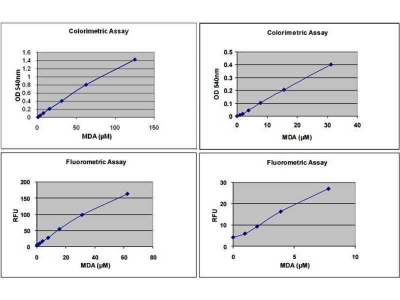- Spectrophotometric Measurement: Transfer 200 μL of the MDA standards and samples to a 96 well microplate compatible with a spectrophotometric plate reader. Remember to include a 0 μM 5 blank control. It is recommended that duplicates of each standard and sample should be read. Read the absorbance at 532nm. Fluorometric Measurement: Transfer 150 μL of the MDA standards and samples to a 96 well black fluorescence microplate compatible with a fluorometric plate reader. Remember to include a 0 μM blank control. It is recommended that duplicates of each standard and sample should be read. Read the plate at 540 nm excitation and 590 nm emission.