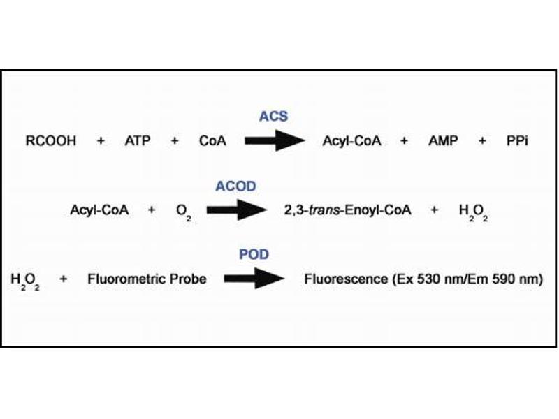 - Free Fatty Acid Assay Kit measures non-esterified fatty acids (NEFA) in serum and plasma by a coupled enzymatic reaction system (ACS-ACOD Method). First, Acyl CoA Synthetase (ACS) catalyzes fatty acid acylation of coenzyme A. Next, the acyl-CoA product is oxidized by Acyl CoA Oxidase (ACOD), producing hydrogen peroxide which reacts with the kit's Fluorometric Probe (Ex. 530-560 nm/Em. 585-595 nm). The Free Fatty Acid Assay Kit is a simple, fluorometric assay that quantitatively measures the free fatty acid concentration (non-esterified) in various samples using a 96-well microtiter plate format. Each kit provides sufficient reagents to perform up to 100 assays, including blanks, standards and unknown samples. The kit contains a palmitic acid standard and has a detection sensitivity limit of ~5 μM. Note: This kit is not suitable for urine or heparin-containing samples. Fatty acids (C8 and longer) can be quantified with this kit.