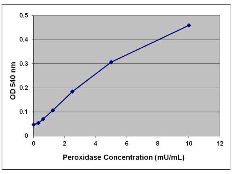 - A serial dilution will be necessary depending on the total H2O2 or peroxidase present. Extremely high levels of H2O2 (≥ 500 μM final concentration) or peroxidase (≥ 100 mU/mL) can lower the absorbance because excess H2O2 or peroxidase can further oxidize the reaction product.
