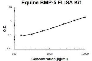 Background: Bone morphogenetic protein 5 is a protein that in humans is encoded by the BMP5 gene.1,2,3 The protein encoded by this gene is member of the TGFbeta superfamily. Bone morphogenetic proteins are known for their ability to induce bone and cartilage development. BMP5 may play a role in certain cancers. Like other BMP's BMP5 is inhibited by chordin and noggin. It is expressed in the trabecular meshwork and optic nerve head and may have a role in the development and normal function. It is also expressed in the lung and liver. BMP-5 is mapped on horse equine chromosome 6.4 The standard used in this kit is recombinant BMP-5 with the monomer molecular mass of 18KDa.