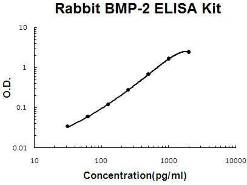 Background: Bone morphogenetic protein-2(BMP-2, BMP 2A) belongs to the transforming growth factor beta(TGF-beta) superfamily. It is thought to be involved in cartilage and bone formation during embryogenesis, but may have additional functions in morphogenesis as implied by its expression in various organs and embryonic tissues of mice.1 BMP-2 has been identified as a candidate mediator of retinoid activity. BMP-2 protein induces medulloblastoma cell apoptosis, whereas the BMP-2 antagonist noggin blocks both retinoid and BMP-2-induced apoptosis. BMP-2 also induces p38 mitogen-activated protein kinase(MAPK), which is necessary for BMP-2 and retinoid-induced apoptosis.2 Bone morphogenic proteins(BMPs) are known to promote osteogenesis, and clinical trials are currently underway to evaluate the ability of certain BMPs to promote fracture-healing and spinal fusion.3 The standard product used in this kit is recombinant rabbit BMP-2, constituting dimer by two chains of 114 amino acids with the molecular mass of 26KDa.