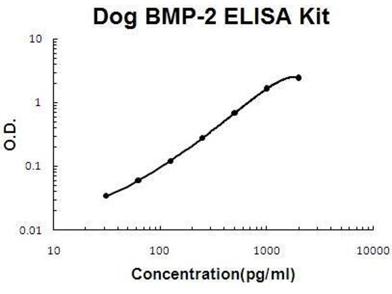 Background: Bone morphogenetic protein-2(BMP-2, BMP 2A) belongs to the transforming growth factor beta(TGF-beta) superfamily. It is thought to be involved in cartilage and bone formation during embryogenesis, but may have additional functions in morphogenesis as implied by its expression in various organs and embryonic tissues of mice. BMP-2 has been identified as a candidate mediator of retinoid activity. BMP-2 protein induces medulloblastoma cell apoptosis, whereas the BMP-2 antagonist noggin blocks both retinoid and BMP-2-induced apoptosis. BMP-2 also induces p38 mitogen-activated protein kinase(MAPK), which is necessary for BMP-2 and retinoid-induced apoptosis. Bone morphogenic proteins(BMPs) are known to promote osteogenesis, and clinical trials are currently underway to evaluate the ability of certain BMPs to promote fracture-healing and spinal fusion. The standard product used in this kit is recombinant Dog Canine BMP-2, constituting dimer by two chains of 114 amino acids with the molecular mass of 26KDa.