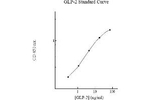Prepare all reagents, standard solutions, and samples as instructed. Bring all reagents to room temperature before use. The assay is performed at room temperature (20-25 °C). Remove excess microplate strips from the plate frame and return them immediately to the foil pouch with desiccants inside. Reseal the pouch securely to minimize exposure to water vapor and store in a vacuum desiccator. Add 50 l of GLP-2 Standard or sample per well. Cover wells with a sealing tape and incubate for 2 hours. Start the timer after the last addition. Wash five times with 200 l of Wash Buffer manually. Invert the plate each time and decant the contents, hit 4-5 times on absorbent material to completely remove the liquid. If using a machine, wash six times with 300 l of Wash Buffer and then invert the plate, decanting the contents, hit 4-5 times on absorbent material to completely remove the liquid. Add 50 l of Biotinylated GLP-2 Antibody to each well and incubate for 1 hour. Wash the microplate as described above. Add 50 l of Streptavidin-Peroxidase Conjugate per well and incubate for 30 minutes. Turn on the microplate reader and set up the program in advance. Wash the microplate as described above. 5 Add 50 l of Chromogen Substrate per well and incubate for 15 minutes or till the optimal color density develops. Gently tap the plate to ensure thorough mixing and break the bubbles in the well with pipette tip. Add 50 l of Stop Solution to each well. The color will change from blue to yellow. Read the absorbance on a microplate reader at a wavelength of 450 nm immediately. If wavelength correction is available, subtract readings at 570 nm from those at 450 nm to correct optical imperfections. Otherwise, read the plate at 450 nm only. Please note that some unstable black particles may be generated at high concentration points after stopping the reaction for about 10 minutes, which will reduce the readings.