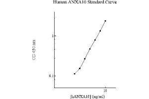 - Human Annexin A10 Microplate: A 96-well polystyrene microplate (12 strips of 8 wells) coated with a polyclonal antibody against human annexin A10. Sealing Tapes: Each kit contains 3 precut, pressure sensitive sealing tapes that can be cut to fit the format of the individual assay. Human Annexin A10 Standard: Human annexin A10 in a buffered protein base (6 ng, lyophilized). Biotinylated Human Annexin A10 Antibody (50x): A 50-fold biotinylated polyclonal antibody against human annexin A10 (120 l). MIX Diluent Concentrate (10x): A 10-fold concentrated buffered protein base (30 ml). Wash Buffer Concentrate (20x): A 20-fold concentrated buffered surfactant (30 ml, 2 bottles). Streptavidin-Peroxidase Conjugate (SP Conjugate): A 100-fold concentrate (80 l). Chromogen Substrate: A ready-to-use stabilized peroxidase chromogen substrate tetramethylbenzidine (8 ml). Stop Solution: A 0.5 N hydrochloric acid to stop the chromogen substrate reaction (12 ml).