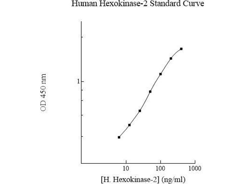 Prepare all reagents, standard solutions, and samples as instructed. Bring all reagents to room temperature before use. The assay is performed at room temperature (20-25 °C). Remove excess microplate strips from the plate frame and return them immediately to the foil pouch with desiccants inside. Reseal the pouch securely to minimize exposure to water vapor and store in a vacuum desiccator. Add 50 l of Human Hexokinase-2 Standard or sample to each well. Gently tap plate to thoroughly coat the wells. Break any bubbles that may have formed. Cover wells with a sealing tape and incubate for 2 hours. Start the timer after the last addition. Wash five times with 200 l of Wash Buffer manually. Invert the plate each time and decant the contents, hit 4-5 times on absorbent material to completely remove the liquid. If using a machine, wash six times with 300 l of Wash Buffer and then invert the plate, decanting the contents, hit 4-5 times on absorbent material to completely remove the liquid. Add 50 l of Biotinylated Human Hexokinase-2 Antibody to each well. Gently tap plate to thoroughly coat the wells. Break any bubbles that 6 may have formed. Cover wells with a sealing tape and incubate for 1 hour. Wash the microplate as described above. Add 50 l of SP Conjugate to each well. Gently tap plate to thoroughly coat the wells. Break any bubbles that may have formed. Cover wells with a sealing tape and incubate for 30 minutes. Turn on the microplate reader and set up the program in advance. Wash the microplate as described above. Add 50 l of Chromogen Substrate to each well. Gently tap plate to thoroughly coat the wells. Break any bubbles that may have formed. Incubate for 20 minutes or until the optimal blue color density develops. Add 50 l of Stop Solution to each well. The color will change from blue to yellow. Gently tap plate to ensure thorough mixing. Break any bubbles that may have formed. Read the absorbance on a microplate reader at a wavelength of 450 nm immediately. If wavelength correction is available, subtract readings at 570 nm from those at 450 nm to correct optical imperfections. Otherwise, read the plate at 450 nm only. Please note that some unstable black particles may be generated at high concentration points after stopping the reaction for about 10 minutes, which will reduce the readings.
