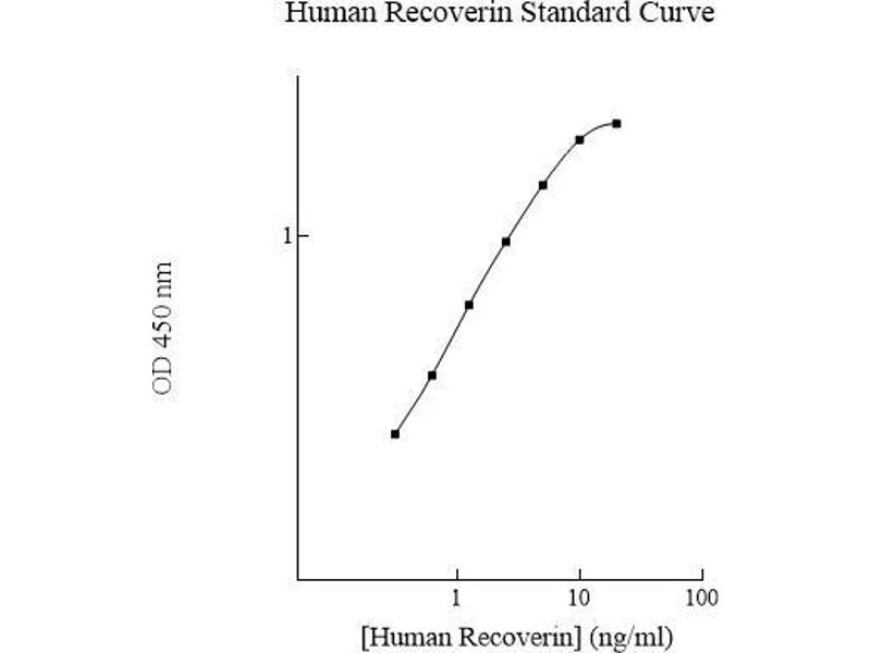 - The AssayMax™ Human Recoverin ELISA (Enzyme-Linked Immunosorbent Assay) kit is designed for detection of human recoverin in plasma, serum, tissue extracts, and cell culture samples. This assay employs a quantitative sandwich enzyme immunoassay technique that measures human recoverin in approximately 5 hours. A polyclonal antibody specific for human recoverin has been pre-coated onto a 96-well microplate with removable strips. Recoverin in standards and samples is sandwiched by the immobilized polyclonal antibody and biotinylated polyclonal antibody specific for human recoverin, which is recognized by a streptavidin-peroxidase conjugate. All unbound material is washed away and a peroxidase enzyme substrate is added. The color development is stopped and the intensity of the color is measured.