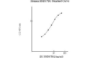 - The AssayMaxTM Human HSD17B1 ELISA (Enzyme-Linked Immunosorbent Assay) kit is designed for detection of HSD17B1 in human plasma, serum, and cell culture samples. This assay employs a quantitative sandwich enzyme immunoassay technique that measures human HSD17B1 in approximately 4 hours. A polyclonal antibody specific for human HSD17B1 has been pre- coated onto a 96-well microplate with removable strips. HSD17B1 in standards and samples is sandwiched by the immobilized antibody and a biotinylated polyclonal antibody specific for human HSD17B1, which is recognized by a streptavidin-peroxidase (SP) conjugate. All unbound material is washed away and a peroxidase enzyme substrate is added. The color development is stopped and the intensity of the color is measured.