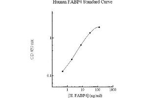 Prepare all reagents, standard solutions, and samples as instructed. Bring all reagents to room temperature before use. The assay is performed at room temperature (20-25 °C). Remove excess microplate strips from the plate frame and return them immediately to the foil pouch with desiccants inside. Reseal the pouch securely to minimize exposure to water vapor and store in a vacuum desiccator. Add 50 l of Human FABP4 Standard or sample to each well. Gently tap plate to thoroughly coat the wells. Break any bubbles that may have formed. Cover wells with a sealing tape and incubate for 2 hours. Start the timer after the last addition. Wash five times with 200 l of Wash Buffer manually. Invert the plate each time and decant the contents, hit 4-5 times on absorbent material to completely remove the liquid. If using a machine, wash six times with 300 l of Wash Buffer and then invert the plate, decanting the contents, hit 4-5 times on absorbent material to completely remove the liquid. Add 50 l of Biotinylated Human FABP4 Antibody to each well. Gently tap plate to thoroughly coat the wells. Break any bubbles that may have formed. Cover wells with a sealing tape and incubate for 2 hours. Wash the microplate as described above. Add 50 l of SP Conjugate to each well. Gently tap plate to thoroughly coat the wells. Break any bubbles that may have formed. Cover wells with a sealing tape and incubate for 30 minutes. Turn on the microplate reader and set up the program in advance. Wash the microplate as described above. Add 50 l of Chromogen Substrate to each well. Gently tap plate to thoroughly coat the wells. Break any bubbles that may have formed. Incubate for 20 minutes or until the optimal blue color density develops. Add 50 l of Stop Solution to each well. The color will change from blue to yellow. Gently tap plate to ensure thorough mixing. Break any bubbles that may have formed. 6 Read the absorbance on a microplate reader at a wavelength of 450 nm immediately. If wavelength correction is available, subtract readings at 570 nm from those at 450 nm to correct optical imperfections. Otherwise, read the plate at 450 nm only. Please note that some unstable black particles may be generated at high concentration points after stopping the reaction for about 10 minutes, which will reduce the readings.
