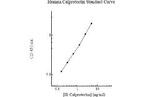 Prepare all reagents, standard solutions, and samples as instructed. Bring all reagents to room temperature before use. The assay is performed at room temperature (20-25 °C). Remove excess microplate strips from the plate frame and return them immediately to the foil pouch with desiccants inside. Reseal the pouch securely to minimize exposure to water vapor and store in a vacuum desiccator. Add 50 l of Human Calprotectin Standard or sample to each well. Gently tap plate to thoroughly coat the wells. Break any bubbles that may have formed. Cover wells with a sealing tape and incubate for 2 hours. Start the timer after the last addition. Wash five times with 200 l of Wash Buffer manually. Invert the plate each time and decant the contents, hit 4-5 times on absorbent material to completely remove the liquid. If using a machine, wash six times with 300 l of Wash Buffer and then invert the plate, decanting the contents, hit 4-5 times on absorbent material to completely remove the liquid. Add 50 l of Biotinylated Human Calprotectin Antibody to each well. Gently tap plate to thoroughly coat the wells. Break any bubbles that may have formed. Cover wells with a sealing tape and incubate for 1 hour. Wash the microplate as described above. Add 50 l of SP Conjugate to each well. Gently tap plate to thoroughly coat the wells. Break any bubbles that may have formed. Cover wells with a sealing tape and incubate for 30 minutes. Turn on the microplate reader and set up the program in advance. Wash the microplate as described above. Add 50 l of Chromogen Substrate to each well. Gently tap plate to thoroughly coat the wells. Break any bubbles that may have formed. Incubate for 20 minutes or until the optimal blue color density develops. 6 Add 50 l of Stop Solution to each well. The color will change from blue to yellow. Gently tap plate to ensure thorough mixing. Break any bubbles that may have formed. Read the absorbance on a microplate reader at a wavelength of 450 nm immediately. If wavelength correction is available, subtract readings at 570 nm from those at 450 nm to correct optical imperfections. Otherwise, read the plate at 450 nm only. Please note that some unstable black particles may be generated at high concentration points after stopping the reaction for about 10 minutes, which will reduce the readings.