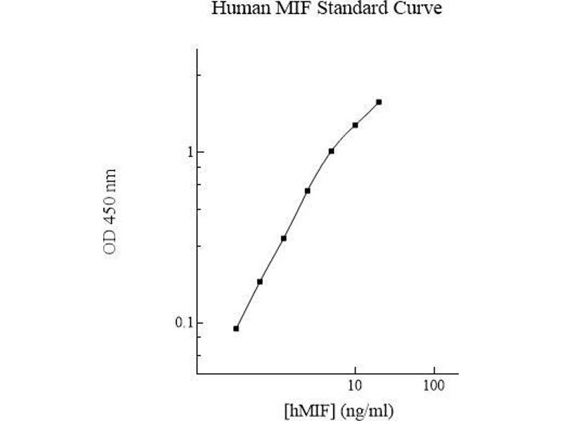 Prepare all reagents, standard solutions, and samples as instructed. Bring all reagents to room temperature before use. The assay is performed at room temperature (20-25 °C). Remove excess microplate strips from the plate frame and return them immediately to the foil pouch with desiccants inside. Reseal the pouch securely to minimize exposure to water vapor and store in a vacuum desiccator. 5 Add 50 l of Human MIF Standard or sample per well. Cover wells with a sealing tape and incubate for 2 hours. Start the timer after the last addition. Wash five times with 200 l of Wash Buffer manually. Invert the plate each time and decant the contents, hit 4-5 times on absorbent material to completely remove the liquid. If using a machine, wash six times with 300 l of Wash Buffer and then invert the plate, decanting the contents, hit 4-5 times on absorbent material to completely remove the liquid. Add 50 l of Biotinylated Human MIF Antibody to each well and incubate for 1 hour. Wash the microplate as described above. Add 50 l of Streptavidin-Peroxidase Conjugate to each well and incubate for 30 minutes. Turn on the microplate reader and set up the program in advance. Wash the microplate as described above. Add 50 l of Chromogen Substrate per well and incubate for 30 minutes or till the optimal blue color density develops. Gently tap plate to ensure thorough mixing and break the bubbles in the well with pipette tip. Add 50 l of Stop Solution to each well. The color will change from blue to yellow. Read the absorbance on a microplate reader at a wavelength of 450 nm immediately. If wavelength correction is available, subtract readings at 570 nm from those at 450 nm to correct optical imperfections. Otherwise, read the plate at 450 nm only. Please note that some unstable black particles may be generated at high concentration points after stopping the reaction for about 10 minutes, which will reduce the readings.