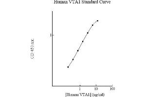 Prepare all reagents, standard solutions, and samples as instructed. Bring all reagents to room temperature before use. The assay is performed at room temperature (20-25 °C). Remove excess microplate strips from the plate frame and return them immediately to the foil pouch with desiccants inside. Reseal the pouch securely to minimize exposure to water vapor and store in a vacuum desiccator. Add 50 l of Human VTA1 Standard or sample per well. Cover wells with a sealing tape and incubate for 2 hours. Start the timer after the last addition. Wash five times with 200 l of Wash Buffer manually. Invert the plate each time and decant the contents, hit 4-5 times on absorbent material to completely remove the liquid. If using a machine, wash six times with 300 l of Wash Buffer and then invert the plate, decanting the contents, hit 4-5 times on absorbent material to completely remove the liquid. Add 50 l of Biotinylated Human VTA1 Antibody to each well and incubate for 1 hour. Wash the microplate as described above. Add 50 l of Streptavidin-Peroxidase Conjugate to each well and incubate for 30 minutes. Turn on the microplate reader and set up the program in advance. Wash the microplate as described above. 5 Add 50 l of Chromogen Substrate per well and incubate for 15 minutes or till the optimal blue color density develops. Gently tap plate to ensure thorough mixing and break the bubbles in the well with pipette tip. Add 50 l of Stop Solution to each well. The color will change from blue to yellow. Read the absorbance on a microplate reader at a wavelength of 450 nm immediately. If wavelength correction is available, subtract readings at 570 nm from those at 450 nm to correct optical imperfections. Otherwise, read the plate at 450 nm only. Please note that some unstable black particles may be generated at high concentration points after stopping the reaction for about 10 minutes, which will reduce the readings.