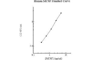 Prepare all reagents, standard solutions, and samples as instructed. Bring all reagents to room temperature before use. The assay is performed at room temperature (20-25 °C). Remove excess microplate strips from the plate frame and return them immediately to the foil pouch with desiccants inside. Reseal the pouch securely to minimize exposure to water vapor and store in a vacuum desiccator. Add 50 l of Human MCSF Standard or sample to each well. Gently tap plate to thoroughly coat the wells. Break any bubbles that may have formed. Cover wells with a sealing tape and incubate for 2 hours. Start the timer after the last addition. Wash five times with 200 l of Wash Buffer manually. Invert the plate each time and decant the contents, hit 4-5 times on absorbent material to completely remove the liquid. If using a machine, wash six times with 300 l of Wash Buffer and then invert the plate, decanting the contents, hit 4-5 times on absorbent material to completely remove the liquid. Add 50 l of Biotinylated Human MCSF Antibody to each well. Gently tap plate to thoroughly coat the wells. Break any bubbles that may have formed. Cover wells with a sealing tape and incubate for 1 hour. Wash the microplate as described above. Add 50 l of Streptavidin-Peroxidase Conjugate to each well. Gently tap plate to thoroughly coat the wells. Break any bubbles that may have 5 formed. Cover wells with a sealing tape and incubate for 30 minutes. Turn on the microplate reader and set up the program in advance. Wash the microplate as described above. Add 50 l of Chromogen Substrate to each well. Gently tap plate to thoroughly coat the wells. Break any bubbles that may have formed. Incubate for 25 minutes or until the optimal blue color density develops. Add 50 l of Stop Solution to each well. The color will change from blue to yellow. Gently tap plate to ensure thorough mixing. Break any bubbles that may have formed. Read the absorbance on a microplate reader at a wavelength of 450 nm immediately. If wavelength correction is available, subtract readings at 570 nm from those at 450 nm to correct optical imperfections. Otherwise, read the plate at 450 nm only. Please note that some unstable black particles may be generated at high concentration points after stopping the reaction for about 10 minutes, which will reduce the readings.
