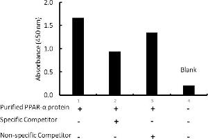 Human PPAR-alpha Transcription Factor Activity Assay. This assay uses a dsDNA coated plate with canonical PPAR-alpha binding sequences to semi-quantitatively detect active PPAR-alpha in lysates or nuclear extracts.