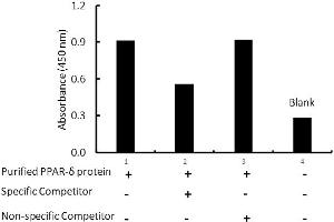 Human PPAR-delta Transcription Factor Activity Assay. This assay uses a dsDNA coated plate with canonical PPAR-delta binding sequences to semi-quantitatively detect active PPAR-delta in lysates or nuclear extracts.