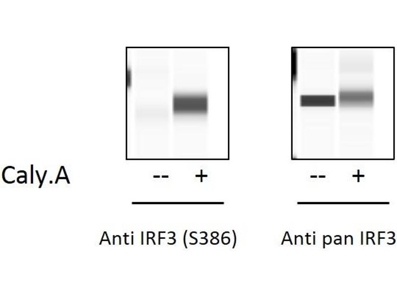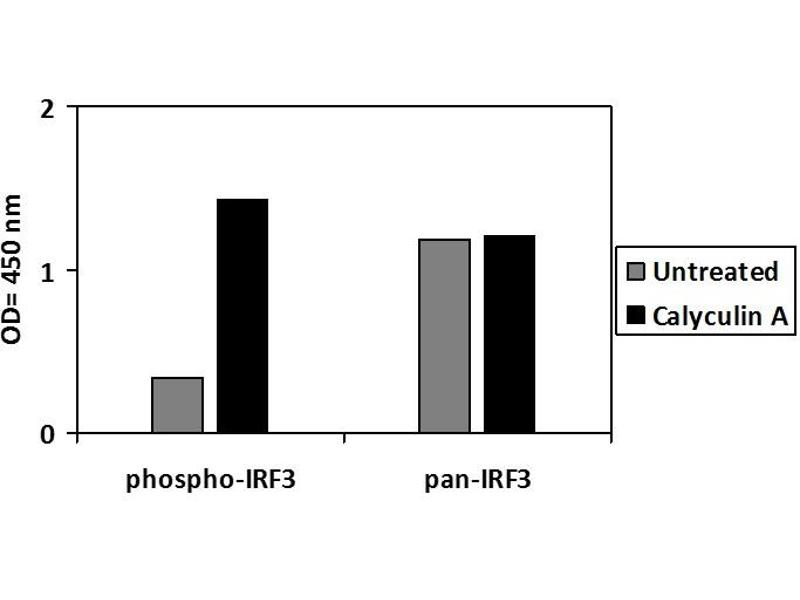 This ELISA kit recognizes Human IRF-3 phosphorylated at site Serine-386 as well as total IRF-3.