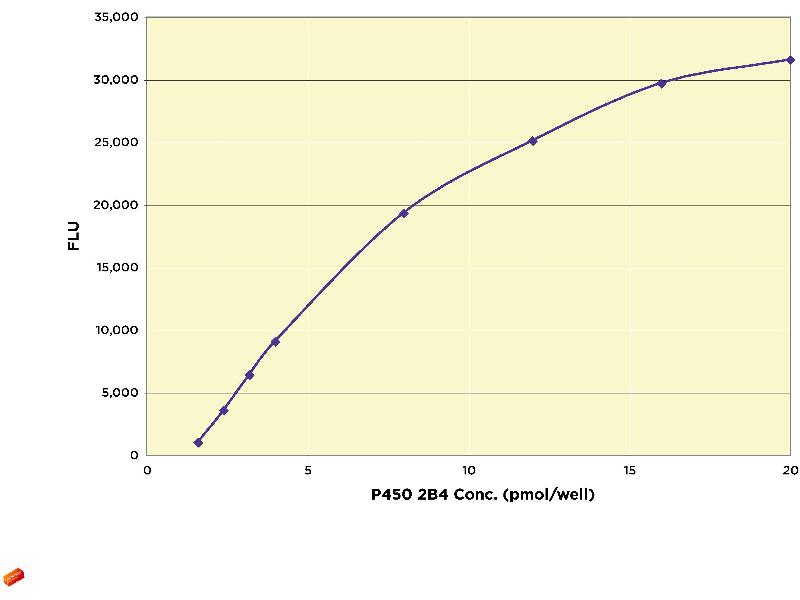 Typical Cyp 2B4 Enzyme Reaction To duplicate wells add 15 μL of P450 enzyme system (equivalent molar ratios of 2B4 P450, Cy- tochrome P450 Oxidoreductase, and Cytochrome b5 in a pre-sonicated 0.66 mg/mL DLPC solu- tion), followed by 75 μL of the supplied Assay Buffer and 5 μL of P450 substrate.