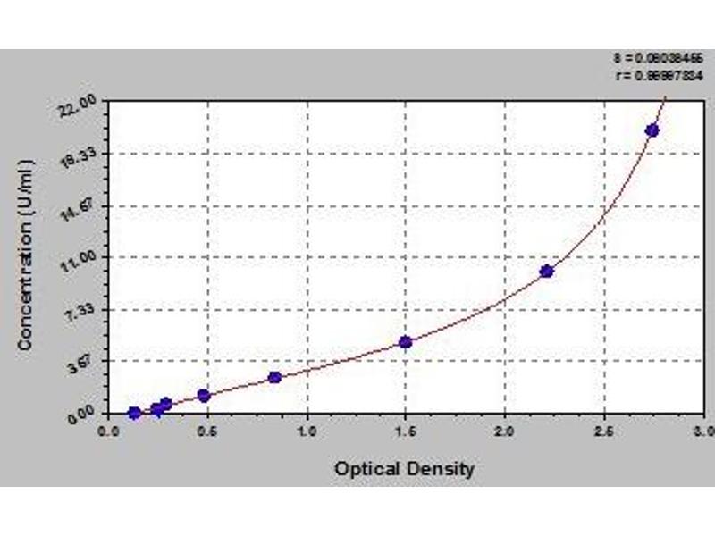 Create a standard curve by reducing the data using computer software capable of generating a four parameter logistic (4-PL) curve fit. As an alternative, construct a standard curve by plotting the mean absorbance for each standard on the x-axis against the concentration on the y-axis and draw a best fit curve through the points on the graph. The data may be linearized by plotting the log of the target antigen concentration versus the log of the O.D. and the best fit line can be determined by regression analysis. This procedure will produce an adequate but less precise fit of the data.