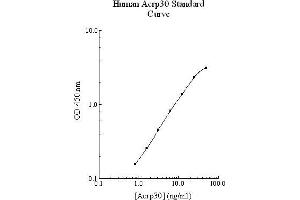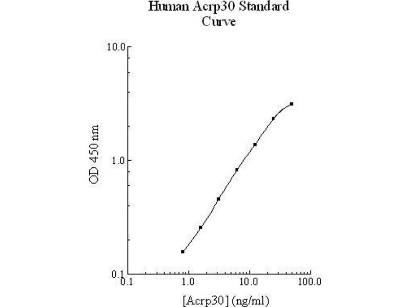 Prepare all reagents, working standards and samples as instructed. Bring all reagents to room temperature before use. The assay is performed at room temperature (20 - 30 °C). Remove excess microplate strips from the plate frame and return them immediately to the foil pouch with desiccant inside. Reseal the pouch securely to minimize exposure to water vapor and store in a vacuum desiccator. Add 50 µL of Standard or sample per well. Cover wells with a sealing tape and incubate for one hour. Start the timer after the last sample addition. Wash five times with 200 µL of Wash Buffer manually. Invert the plate each time and decant the contents, hit it 4-5 times on absorbent paper towel to completely remove the liquid. If using a machine wash six times with 300 µL of Wash Buffer and then invert the plate, decant the contents, hit it 4-5 times on absorbent paper towel to completely remove the liquid. Add 50 µL of Biotinylated Adiponectin Antibody to each well and incubate for one hour. Wash a microplate as described above. Add 50 µL of Streptavidin-Peroxidase Conjugate per well and incubate for 30 minutes. Turn on the microplate reader and set up the program in advance. Wash a microplate as described above. Add 50 µL of Chromogen Substrate per well and incubate for about 10 minutes or till the optimal blue color density develops. Gently tap plate to ensure thorough mixing and break the bubbles in the well with pipette tip. Add 50 µL of Stop Solution to each well. The color will change from blue to yellow. Read the absorbance on a microplate reader at a wavelength of 450 nm immediately. If wavelength correction is available, subtract readings at 570 nm from those at 450 nm to correct optical imperfections. Otherwise, read the plate at 450 nm only. Please note that some unstable black particles may be generated at high concentration points after stopping the reaction for about 10 minutes, which will reduce the readings. 3