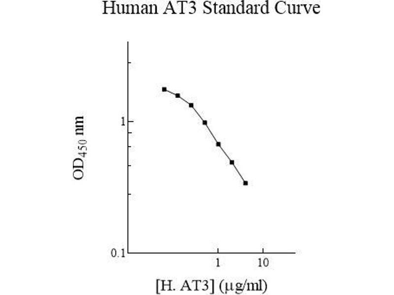 - Human Antithrombin III Microplate: A 96-well polystyrene microplate (12 strips of 8 wells) coated with a polyclonal antibody against human ATIII. Sealing Tapes: Each kit contains 3 precut, pressure sensitive sealing tapes that can be cut to fit the format of the individual assay. Human Antithrombin III Standard: Human ATIII in a buffered protein base (9.6 μg, lyophilized). Biotinylated Human Antithrombin III Protein (6x): 1 vial, lyophilized. EIA Diluent Concentrate (10x): A 10-fold concentrated buffered protein base (30 ml). Wash Buffer Concentrate (20x): A 20-fold concentrated buffered surfactant (30 ml). SP Conjugate (100x): A 100-fold concentrate (80 l). Chromogen Substrate (1x): A stabilized peroxidase chromogen substrate tetramethylbenzidine (8 ml). Stop Solution (1x): A 0.5 N hydrochloric acid solution to stop the chromogen substrate reaction (12 ml).
